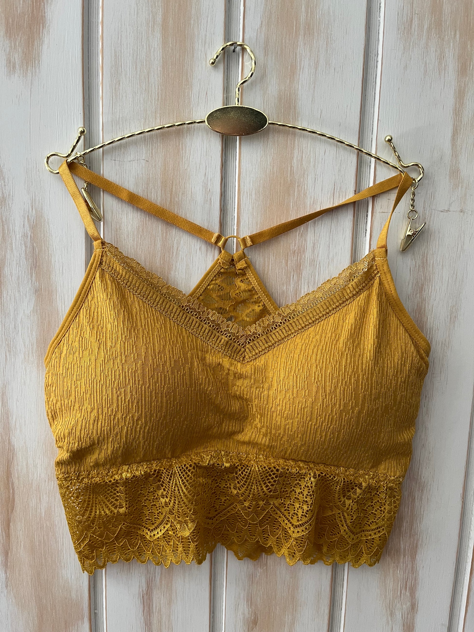 Lindo bralette con encaje. Copas con almohadillas removibles que moldean el busto y proporcionan mayor comodidad. Bella espalda cruzada con encajes. Sin broche.